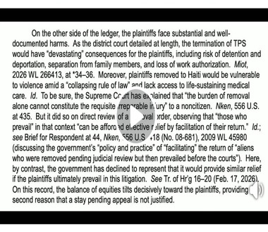 De l’autre côté de la balance, les plaignants font face à des préjudices importants et bien documentés. Comme l’a expliqué en détail le tribunal de district, la fin du TPS aurait des conséquences « dévastatrices » pour les plaignants, notamment le risque de détention et de déportation, la séparation des membres de leur famille et la perte de leur autorisation de travail.